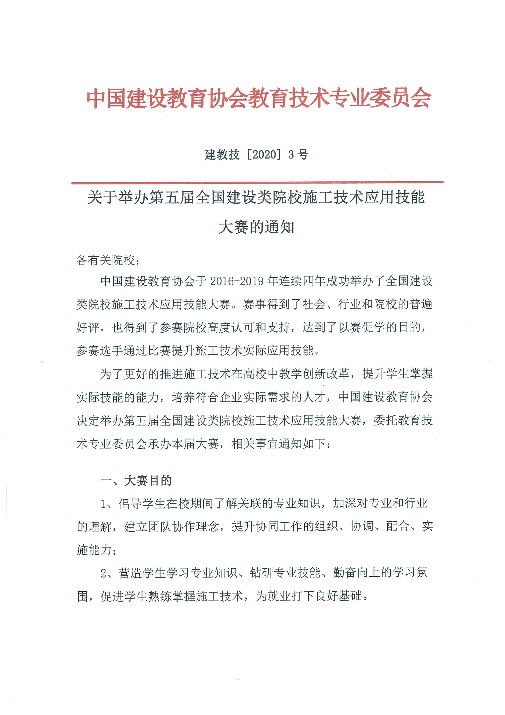 为了更好的推进施工技术在高校中教学创新改革,提升学生掌握实际技能的能力,培养符合企业实际需求的人才,中国建设教育协会决定举办第五届全国建设类院校施工技术应用技能大赛,委托教育技术专业委员会承办本届大赛,相关事宜通知如下: