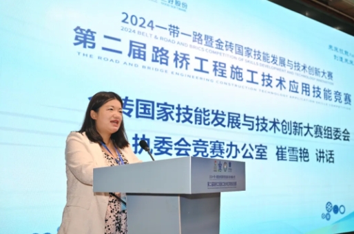 金砖国家技能发展与技术创新大赛执委会副主任、金砖国家工商理事会技能发展应用技术与创新中方工作组执行总监 崔雪艳进行了致辞。她表示,路桥工程施工技术应用赛项已在金砖大赛机制下连续举办两届,组织技能竞赛良好地搭建了技术技能人才沟通交流、技艺切磋、思想碰撞的桥梁,也是金砖技创组开展未来技能开发、国际团体技能标准制定、国际化未来技术技能人才联合培养的重要抓手。未来,金砖技创组将持续开展金砖+国家双边、多边国际项目合作,在技术标准课程开发、联合办学建设、活动会议培训、资源服务交流、开展国际赛事、组织创新联盟六大板块持续发力,并将承报给金砖国家领导人的重要成果设计逐项落地实施。