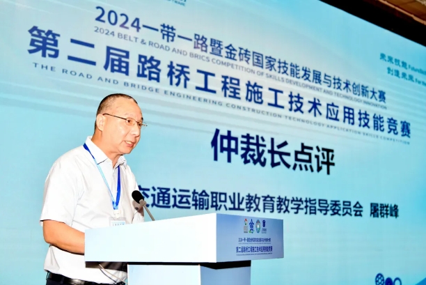 在8月22日的大赛闭幕式上,全国交通运输职业教育教学指导委员会秘书长 屠群峰作为仲裁长发表了致辞,他表示:强大的高水平技术人才是支撑中国制造、中国创造的重要基础,是中国能领跑世界的根本。金砖大赛顺应时代之需,通过坚持丝路精神的基本原则与“未来技能,创造未来”的办赛理念,积极参与培养“一带一路”沿线各国经济产业发展急需的多维度、多纵深的技术技能人才,在推广中国先进职教理念与技术的同时,也将“大国工匠”的火种传递到青年人心中。本届路桥赛项,为广大参赛选手提供了展示精湛技能、相互切磋技艺的平台,对壮大交通领域高水平技能人才队伍、推动经济社会发展与“一带一路”建设具有积极的推动作用。