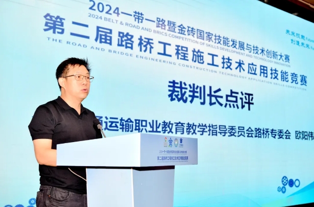 本次大赛的裁判长,全国交通运输职业教育教学指导委员会路桥专业委员会秘书长 欧阳伟在致辞中表示,这次路桥赛项全国总决赛一场高水平的技术比拼,每一位参赛选手都展现出了非凡的专业技能、创新能力和团队协作精神。老师与选手的努力和付出,让我们看到了孕育未来路桥建设领域新星的无限可能,选手良好的素养及拼搏精神,给我们留下了深刻的印象。本届路桥赛项充分发挥了示范引领作用,对深化产教融合、校企合作,促进职业教育高质量发展,打造中国特色职业教育品牌,推动职业教育走出去,都发挥了重要的推动作用。