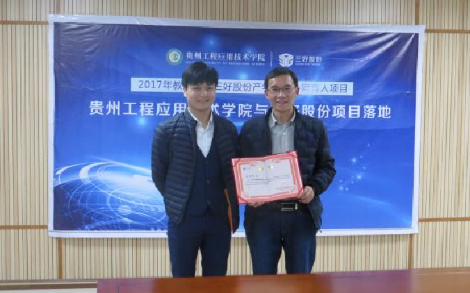 三好股份与贵州工程应用技术学院“2017年教育部与三好股份产学合作协同育人项目”合作协议签订仪式于2017年11月22日在贵州工程应用技术学院西区综合楼隆重举行,标志着三好股份与贵州工程应用技术学院土木建筑工程学院合作项目“土木工程实训中心建设”、“土木工程专业课程虚实结合教学模式研究”正式落地。三好股份大区经理王颉,贵州工程应用技术学院副校长卢凤鹏,教师工作处处长兼教务处副处长罗璇,土木建筑工程学院总支书记赵炜书,院长陈昌禄等院校领导共同出席了签约仪式。