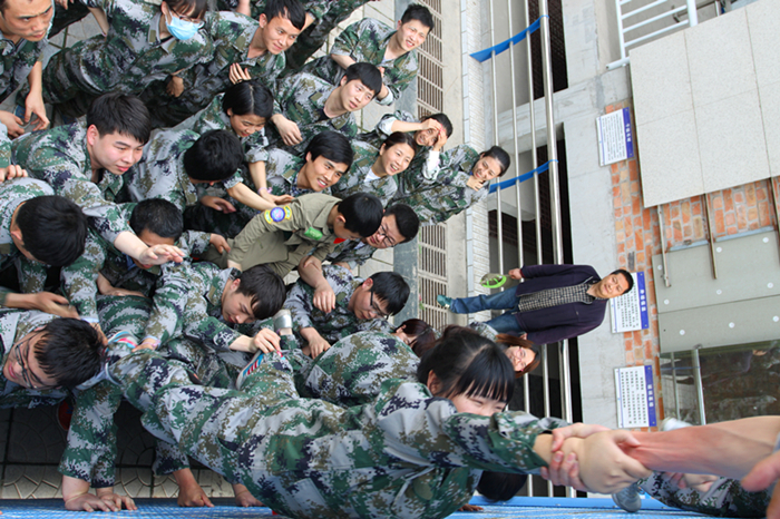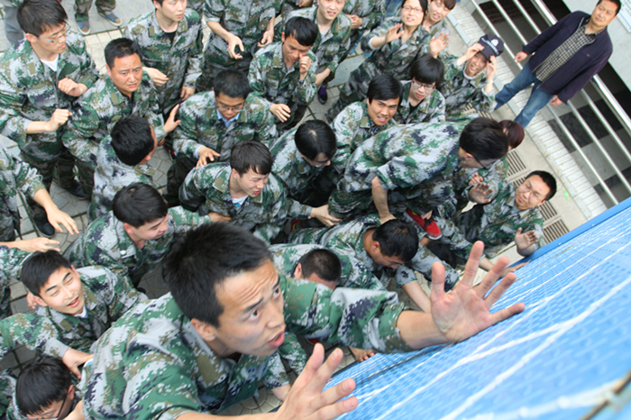 90余人,不能借助任何工具,需要在30分钟内集体翻越高4.3米高的徒壁,这项看似不可能完成的任务,就是本次拓展训练的最终关卡——“翻越毕业墙”。面对挑战,三好人没有退却,他们沉着冷静,组织有序,不怕苦不怕疼,真正的找到了那个最优秀的自己。尤其是研发部的周俊夫,体重200多斤、身材魁梧的他,在这个项目开始之前,就被视为最重要的骨干力量同时也是难点之一。他先是义不容辞的为所有的队友搭起最坚实的人梯,即使肩膀被踩红了踩疼了他也没有任何怨言,数十人先后踩着他宽厚的肩膀爬上了那遥不可及的高墙。在周俊夫完成了他的使命后,剩下的队友如何将他送上高墙,成为了这项挑战的成败关键。面对难题,三好人众志成城,心往一处想,力往一处使,最终顺利助周俊夫安全过关。随着最后一名队员的成功翻越,18分钟!三好软件这个优秀的团队最终以这样一个近乎不可思议的成绩,在本次拓展活动中成功的毕业了。
