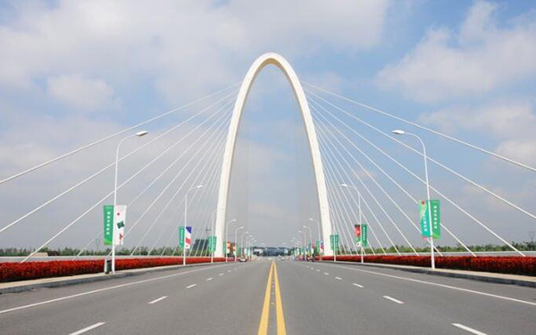 从结构上看,该工程主要为上跨灞河桥梁,主桥部分为中承式系杆拱桥(钢箱混凝土),跨径为22+80+22米,三跨连续;主拱截面为二次抛物线;吊杆为PES.ECW7-37拉索,钢丝采用环氧高强度钢丝,桥面为现浇预应力系、桥梁加桥面板组成。引桥部分为截面0.95×0.99米的装配式预应力空心板梁,跨径为20+14x2米,三跨简支。桥梁基础为均匀摩擦桩,分为排桩和群桩两部分,下部构造为双柱式墩身及盖梁,桥台采用桩柱式桥台。