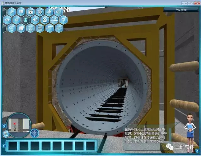 西安三好软件技术股份有限公司特为解决高校实训困局出发,《三好铁路工程仿真综合实训系统》从前期场地勘察、测量,到路基施工、轨道铺设、隧道路桥施工、附属设施施工,到最终的工程验收,全过程展示本专业实训实习的重点、难点。而《三好城市轨道工程仿真综合实训系统》包含洞口密封工序、旋喷桩盾构端头加固及检测施工仿真、袖阀管盾构端头加固及检测施工、地铁盾构隧道辅轨施工、采用冻结法对联络通道施工、盾构管片造型、盾构吊装及始发、采用地面加固法对联络通道施工、盾构管片生产施工、盾构管片基本知识、盾构施工场地建设11大分项。