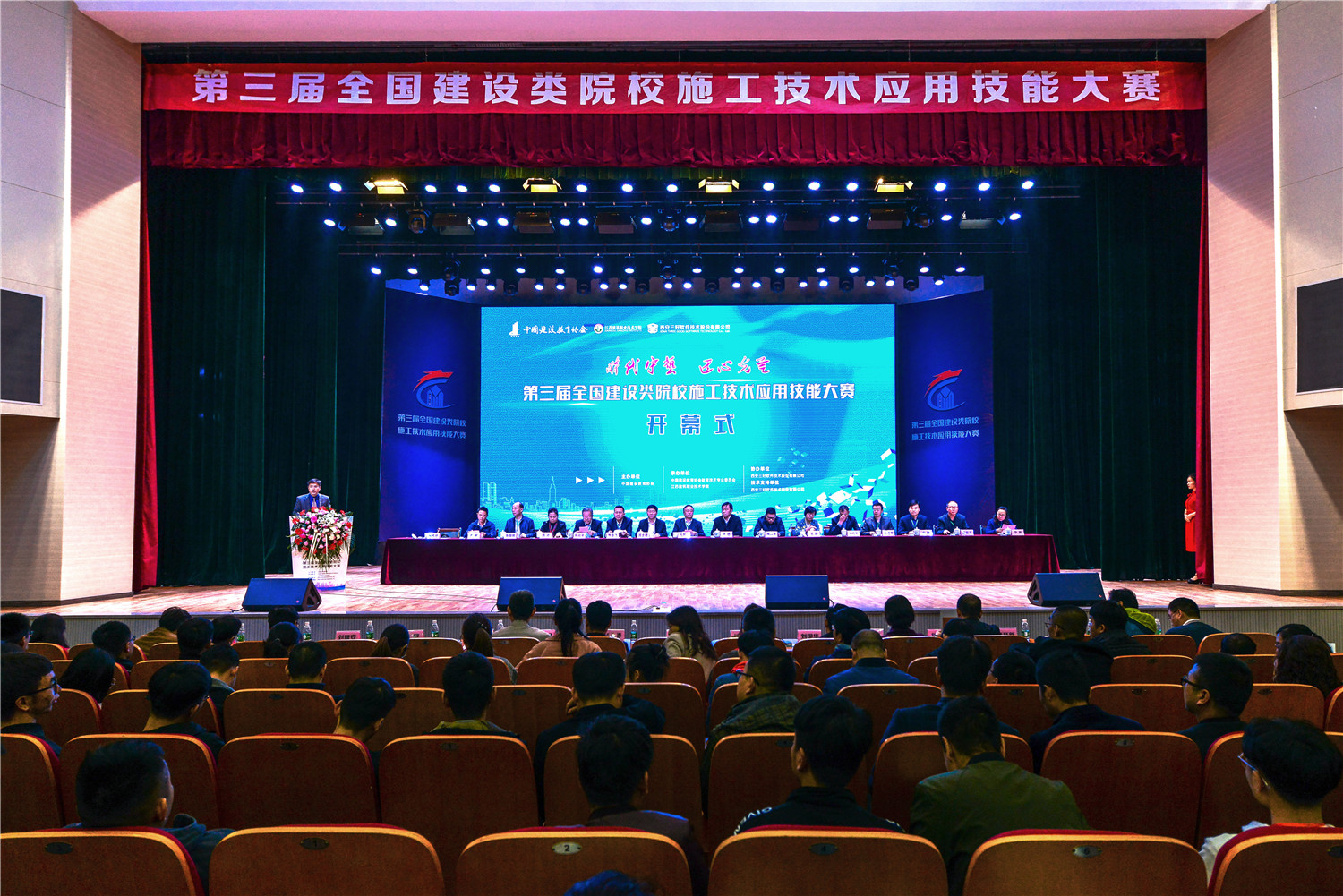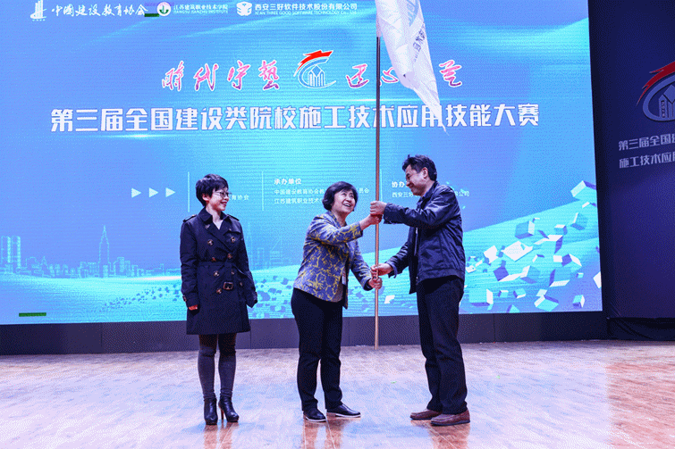 另外,大赛颁奖典礼上还公布了2019年第四届全国建设类院校施工技术应用技能大赛的承办院校——西安建筑科技大学。中国建设教育协会教育技术专业委员会主任王静、江苏建筑职业技术学院实验实训管理中心党总支书记陈年和、西安建筑科技大学土木工程学院黄莺主任进行了庄重的赛旗交接仪式。