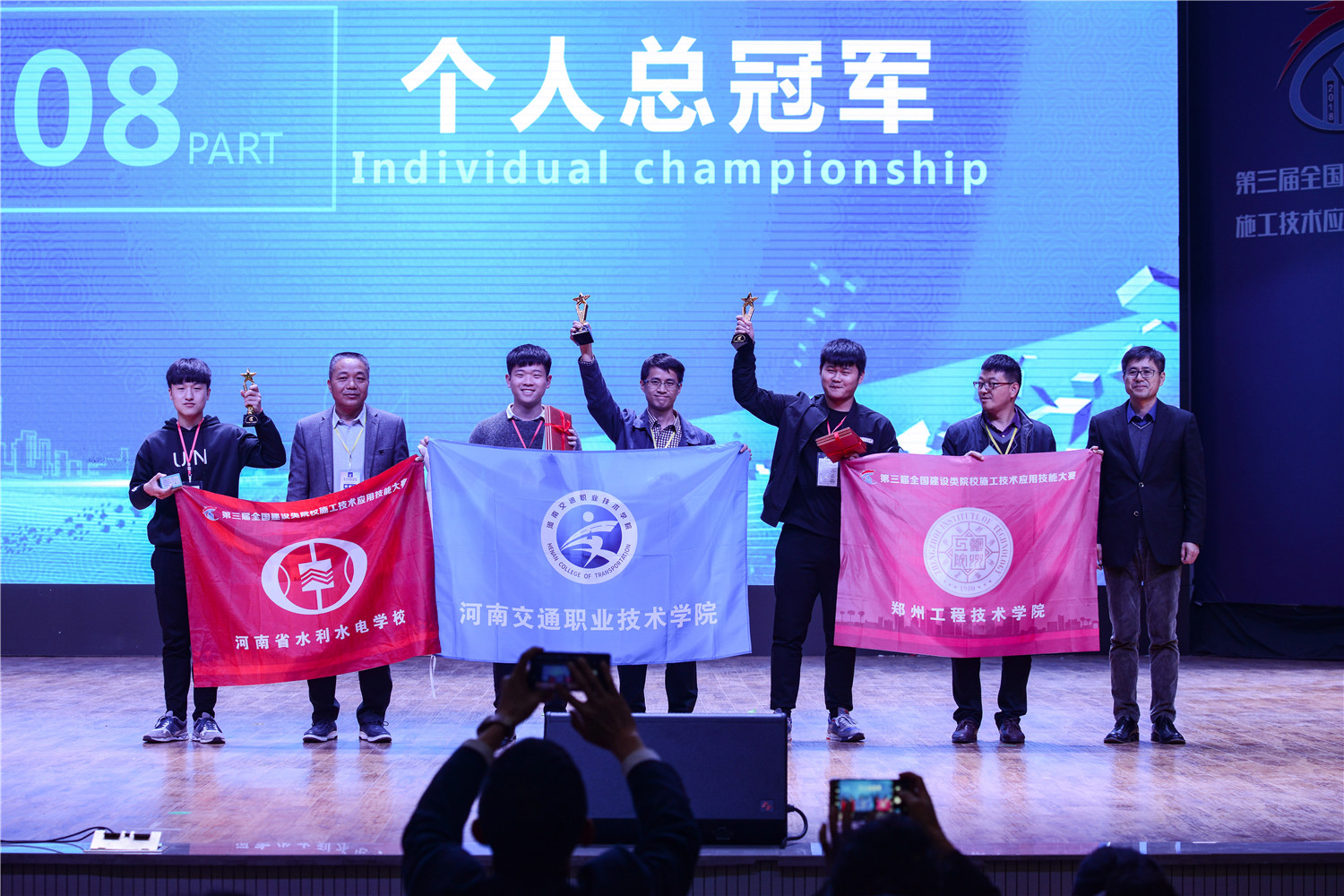 郑州工程技术学院蒋梦新同学、河南交通职业技术学院汲宏飞同学、河南省水利水电学校靳红辉同学分别获得了本次大赛本科组、高职组及中职组的个人总冠军。