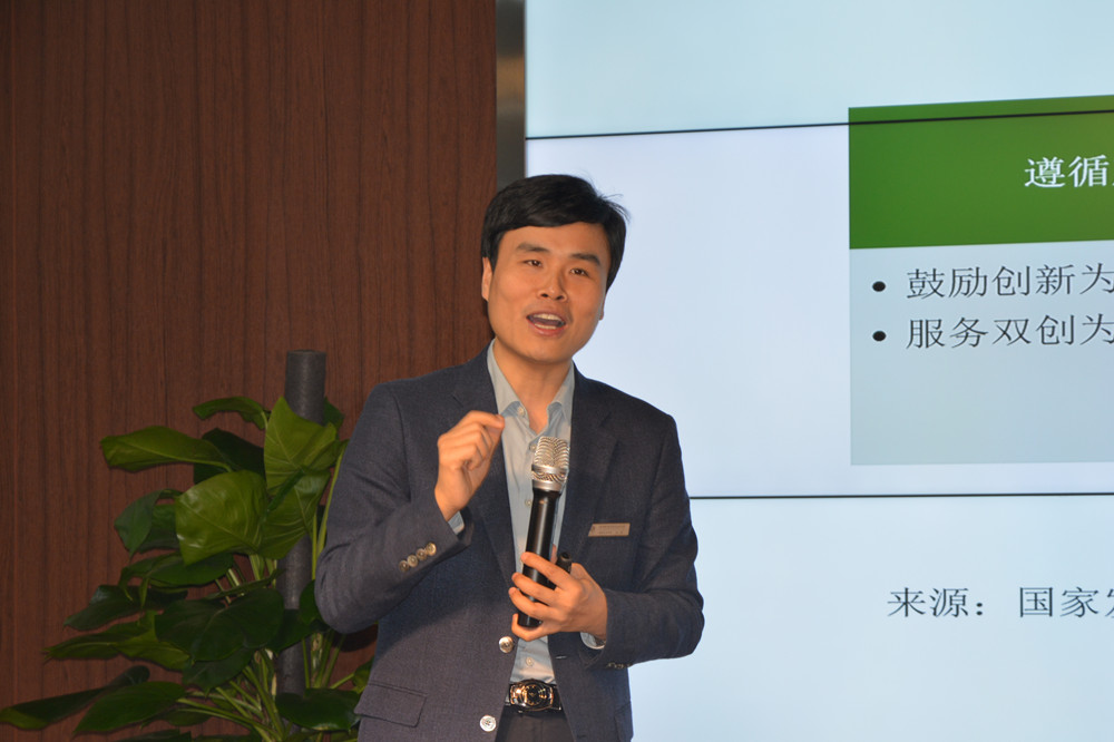 第二个分享的是双创中心负责人研发中心创意部经理项栋,分享主题《双创职业技能培训中心功能与产品介绍》。项经理以双创中心“缔造者”的身份,对双创中心的功能与定位、产品与价值、模式与创新进行了全面、深入的介绍,在整体认知上,对中午的参观、体验做了一个很好的补充,赢得了大家热烈的掌声。