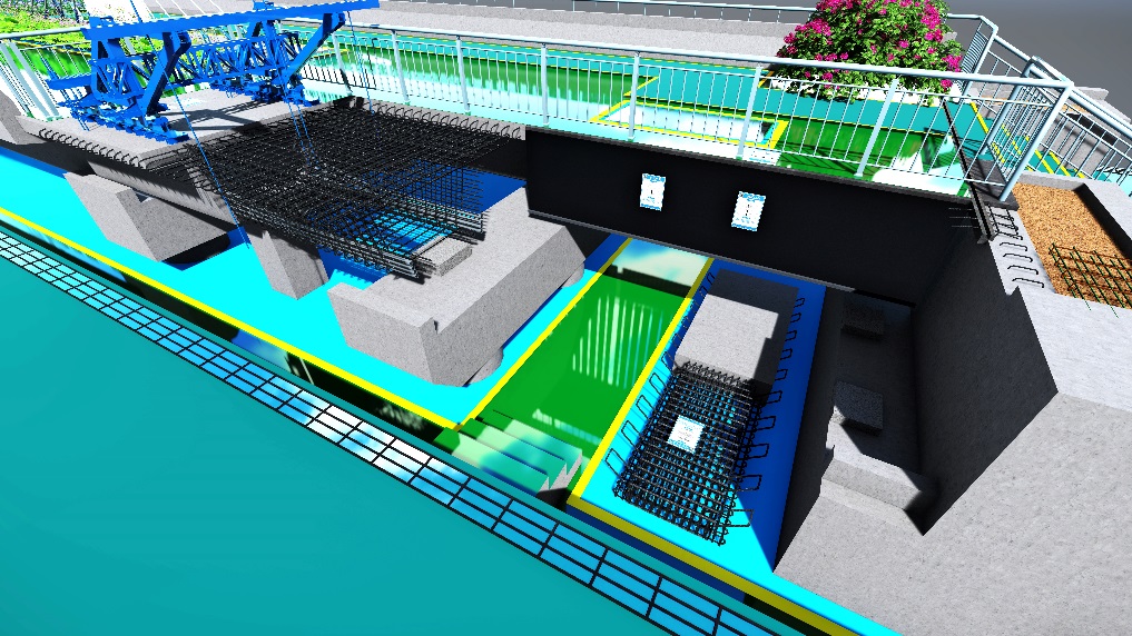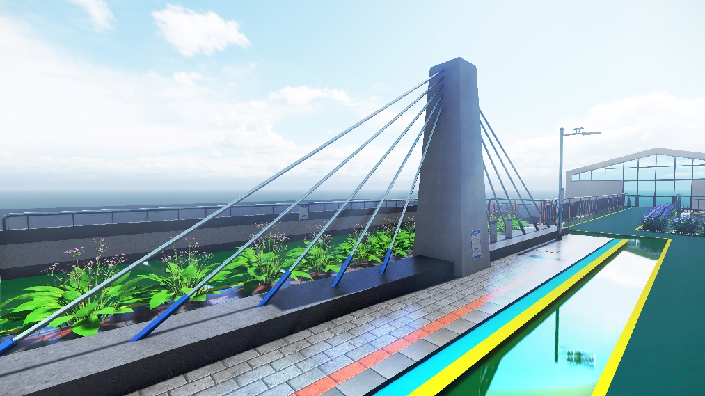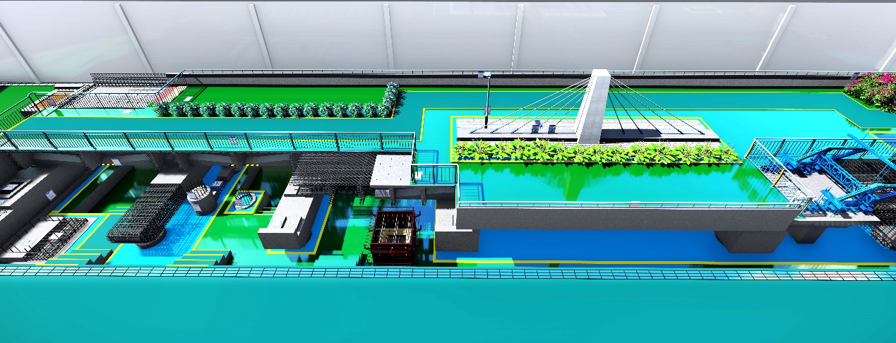 第二部分:斜拉桥,总长10米,宽7米,桥面可供参观通行。桥面上展示斜拉桥拉索安装展示,桥梁南侧做薄壁空心墩半刨裸露钢筋展示及翻模法模板工艺展示。