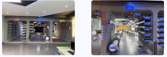 闽南理工学院实训室项目坐落于学院建筑工程实训楼楼面之上,与以往建筑实体模型不同,该项目的技术难度主要是在建筑楼面上进行实体模型的建设和施工,出于对楼承板安全承载力的考量,对工艺的使用和工序的合理安排都提出了更高的技术要求。建筑规划面积200余平米,模型主体结构为轻质承重材料,模型整体布局为双仓式综合管廊剖切形式展示,主要囊括综合管廊节点近百个。实训室在满足管廊构造模型认知需要以外,同时结合滑轨屏、仿真交互平台等数字化、信息化设备,将相关知识体系进行延展、学习要点进行深度剖析,打造出理、实、虚、做、考,五位一体的现代化、信息化综合实训室。